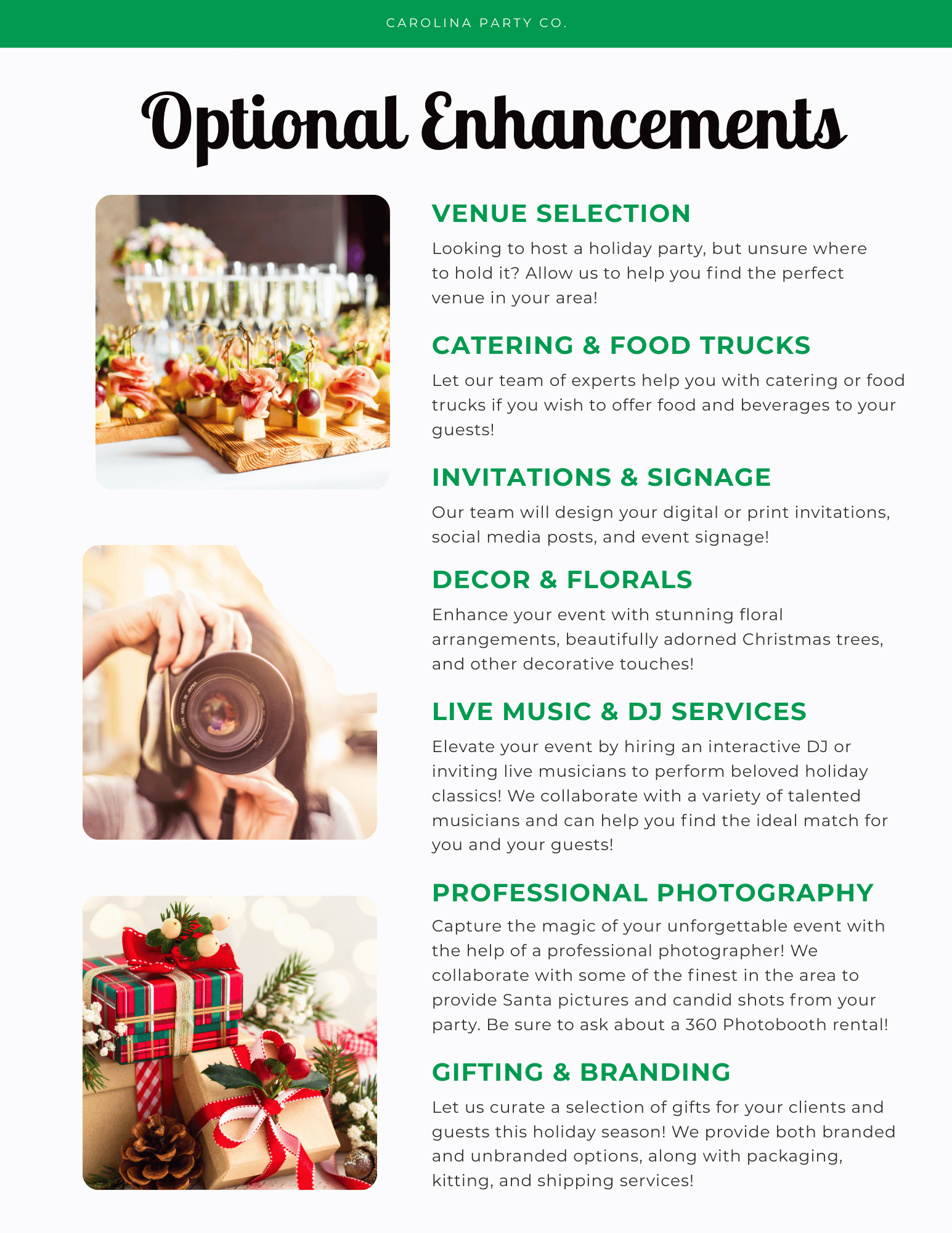 Upgrades are available including catering or food truck coordination, photographers, photobooths, DJs, live music, projector & screen rentals, goodie bags, client gifting, customized signage, charitable team building/drives and more!