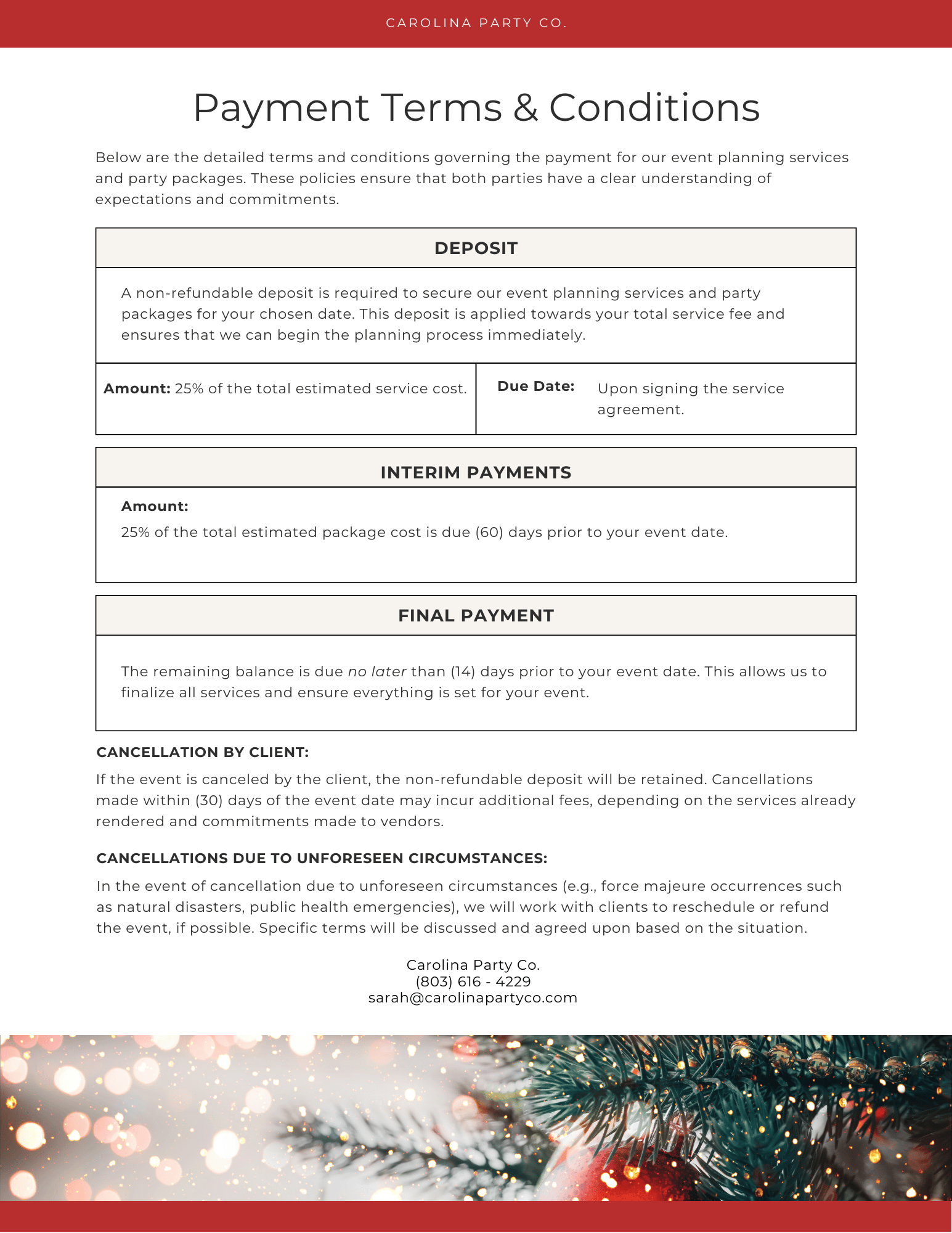 Pricing for our standard package is $50/PP - discounts are available for larger parties (over 50 guests), along with certain customizations to fit your budget!