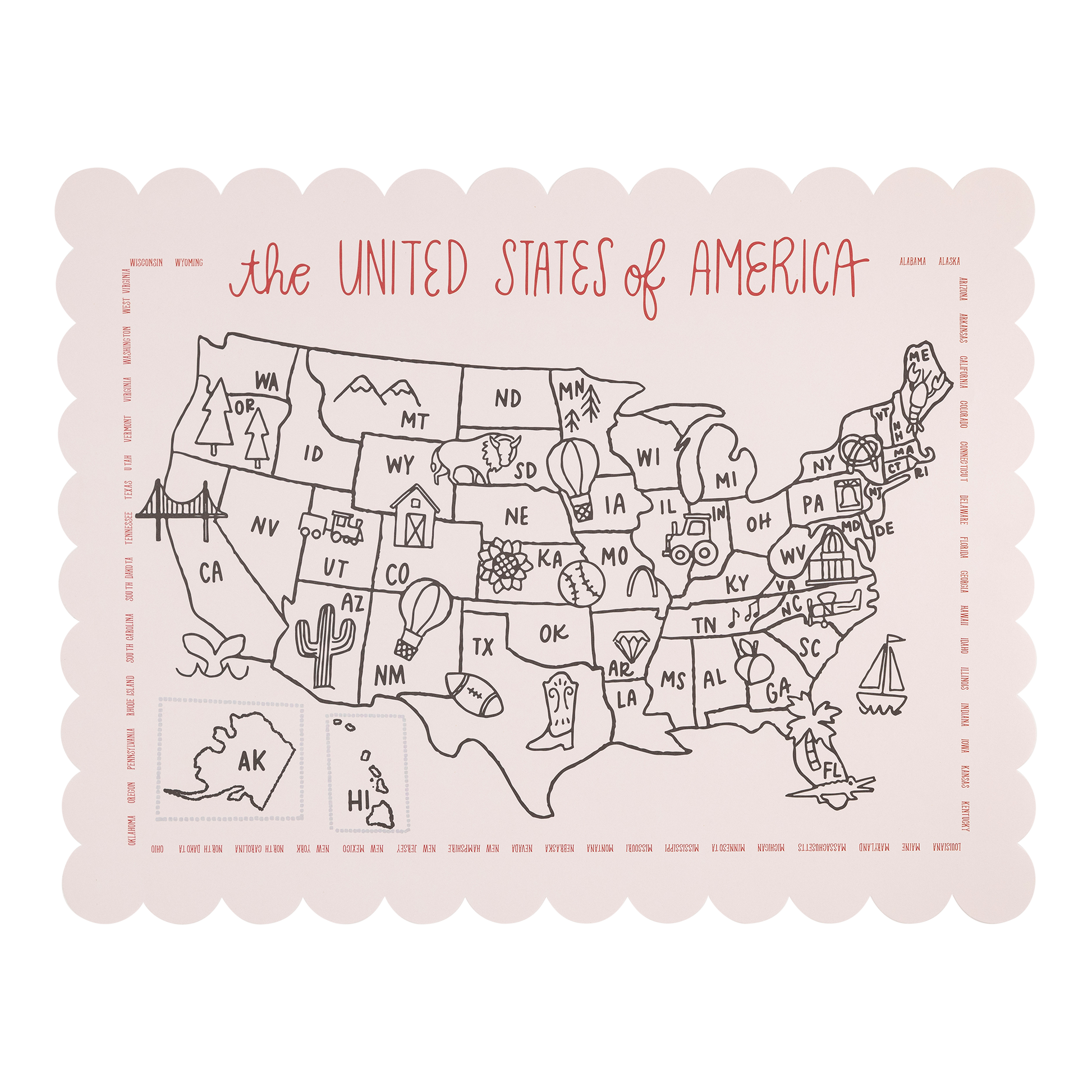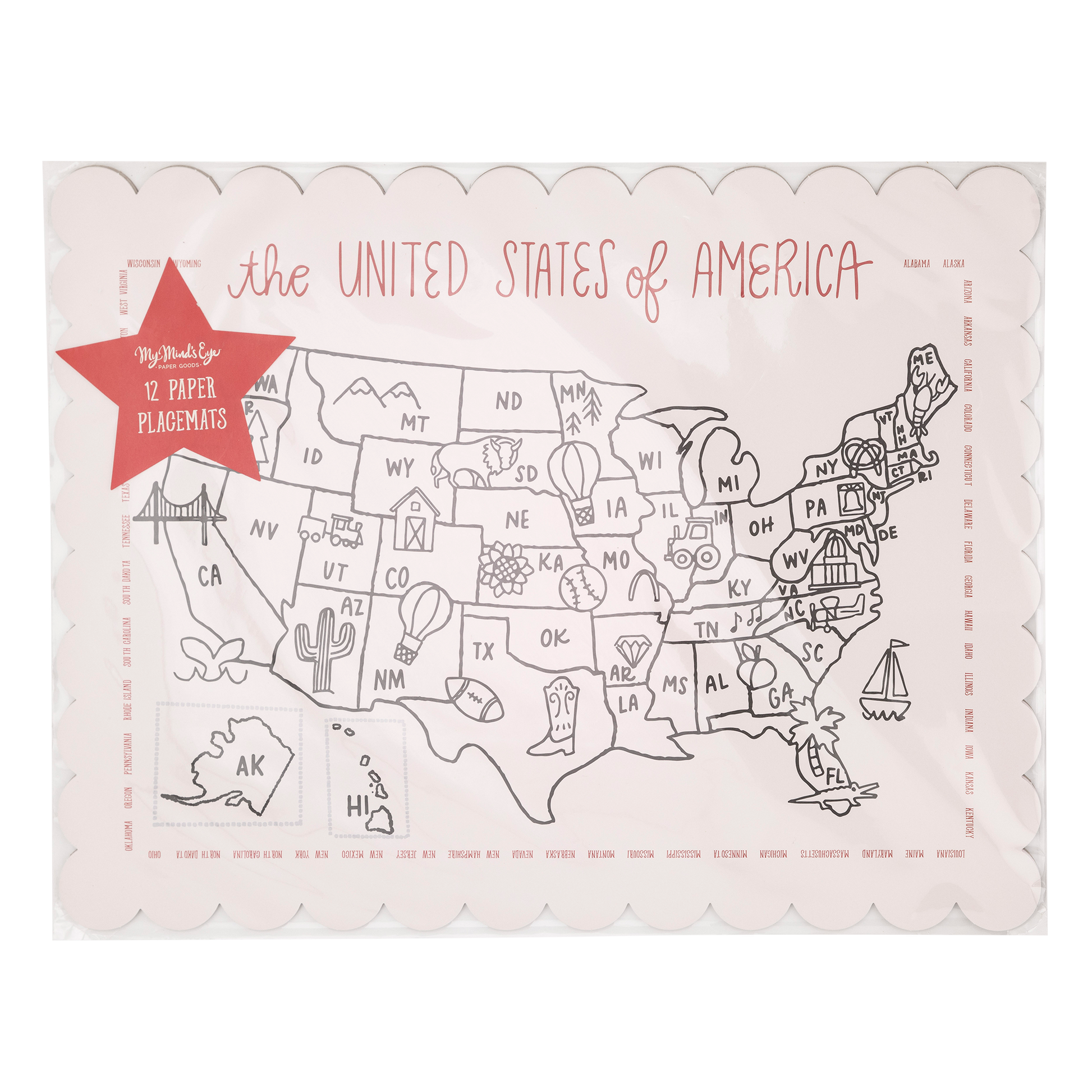 Add some fun to your summer parties and 4th of July celebrations with our USA Map Coloring Placements! Fun for kids and adults alike! Includes 12 paper placemats per pack.